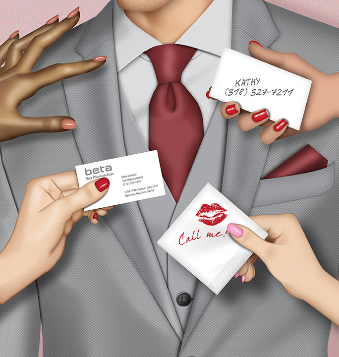 Fashion advertising illustration of a man in a suit with women showing their interest. Inspired by the ZZ Top song..."every girl crazy 'bout a sharp dressed man"